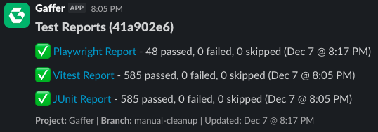 Gaffer shortens your feedback loop to a single Slack notification with a direct link to the full test report.